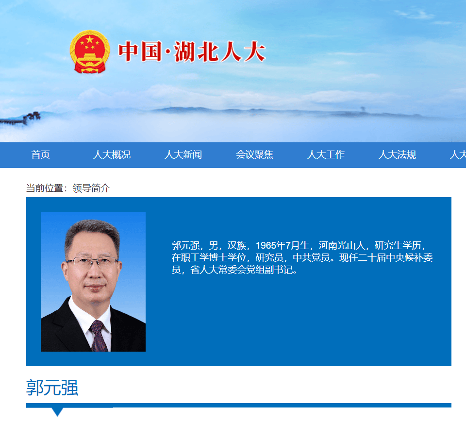 近日,湖北省人大常委会网站“领导简介”栏目更新显示,郭元强已任湖北省人大常委会党组副书记。