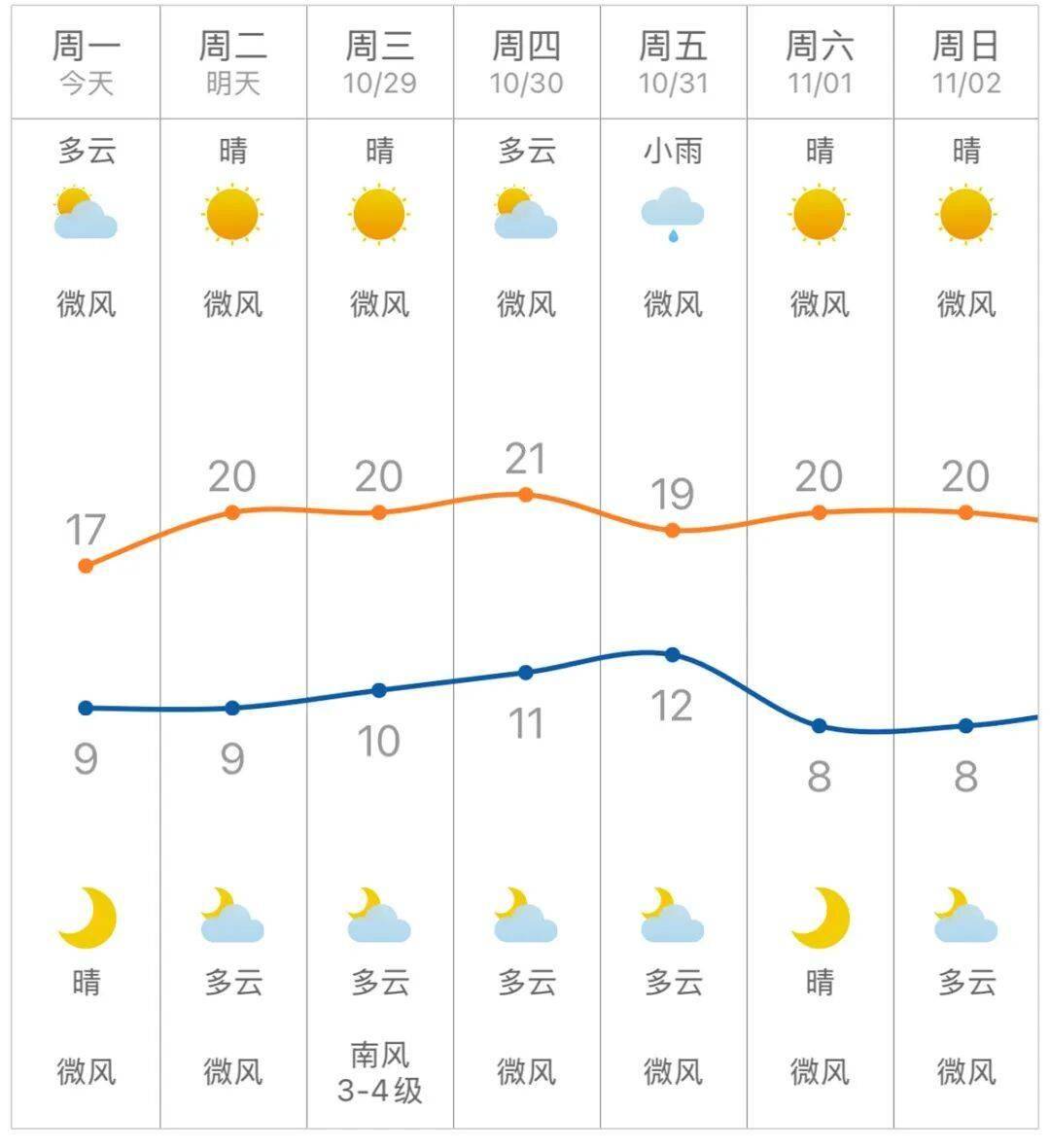 31日到11月1日,阳光回归,早晨多雾,气温起伏稍大。