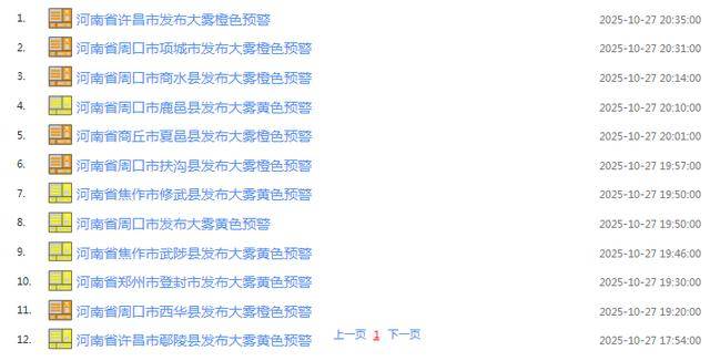 今晚,河南多地发布大雾气象预警。截至10月27日20:40,以下预警信息生效中!