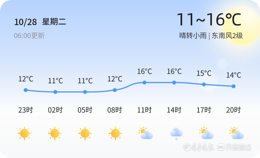今天是10月28日,星期二,农历九月初八。济南市今天天气晴转小雨,气温在11℃至16℃之间,东南风2级,空气湿度较高,达到80%。PM2.5浓度为102,属于轻度污染,建议敏感人群减少户外活动。出行时请注意携带雨具,驾车时保持安全车距,确保行车安全。
