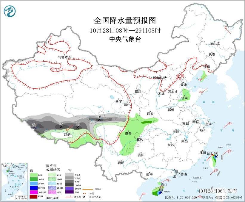 10月28日08时至29日08时,西藏西南部和中东部、青海南部、川西高原北部等地部分地区有中到大雪,局地暴雪或大暴雪(20~25毫米)。陕西南部、四川盆地东北部、海南岛东部和南部、台湾岛北部和东部等地部分地区有中到大雨,其中,海南岛东南部、台湾岛东北部等地局部地区有暴雨(50~90毫米)。内蒙古中部、黑龙江东北部、辽东半岛、西藏中部、山东半岛、海南岛等地部分地区有4~5级风;台湾海峡、台湾以东洋面、东海南部海域、巴士海峡、北部湾、琼州海峡、南海北部和中西部海域将有5~7级风、阵风8~9级。
