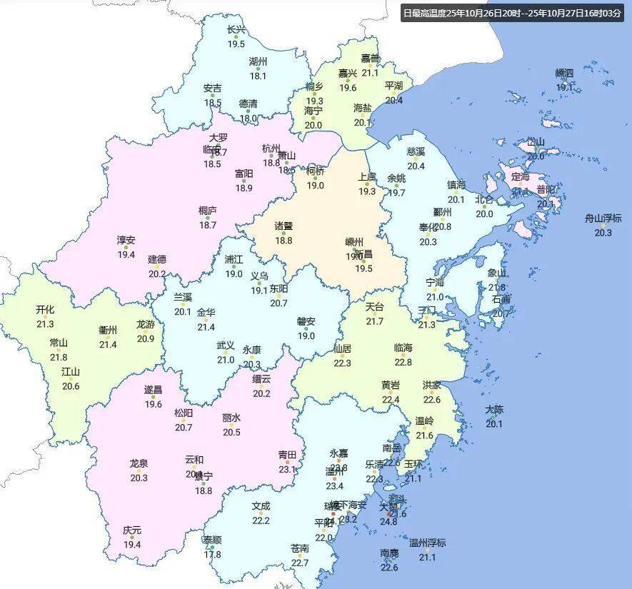 厚厚的云层阻挡了气温上升的步伐,27日白天的最高气温浙北稍低,18-20℃之间,浙中南高些,基本在20-22℃之间,昨天最高气温前三甲均在温州地区: