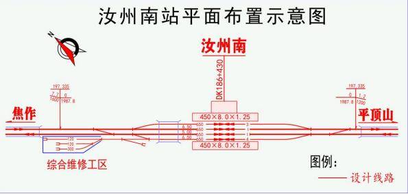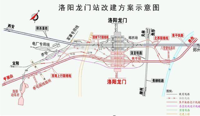 改建洛阳龙门站:本次设计洛阳龙门站按'一站二场”总体布局,总规模为6台15线。其中郑西场为4台8线,焦平场设计为3台7线郑西场共站台1座)。车站西南端将既有存车场扩建为动车所,总规模检查库线4条,存车线24条。