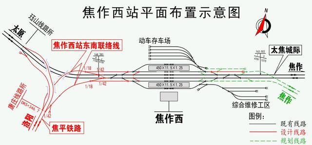改建焦作西站:既有焦作西站为太焦城际上中间站,位于博爱县北侧、河南省道S237 以西。太焦城际速度目标值为250km,有砟轨道,车站规模2台6线,北侧设存车线5条。焦作西站东南联络线引入车站在西咽喉正线插铺 42#道岔,将咽喉区双“八字”渡线调整为单“八字”渡线。站前道路等城市配套设施较完善。