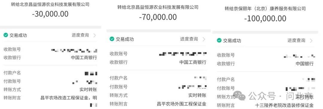 各家施工队提供的转账记录和收据显示,大家线上转账的收款方为北京昌益恒源农业科技发展有限公司或京保颐年,而现金支付的保证金或好处费,只有部分开具了收据,收据上也没有明确钱款的具体用途。“要是不给他这钱,他不让你施工。保证金和好处费是两码事,大多数要的现金。当时说,你交我钱,完事我退给你。我们一家交了60万,总共350万左右。”周先生说。