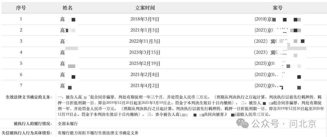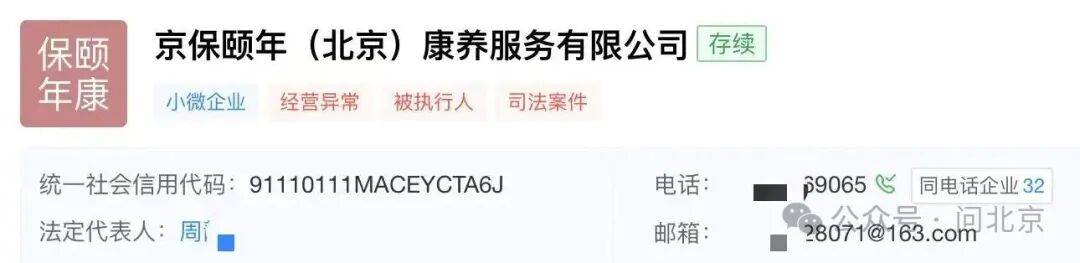 记者在中国执行信息公开网查询发现,2018年到2025年,京保颐年高姓负责人7次被列为被执行人。2017年,这名高姓负责人因在昌平区沙河镇及小汤山镇,虚构项目工程,伪造证明材料,骗取合同履约金,2019年被公安机关抓获,后以合同诈骗罪,被法院判处有期徒刑一年三个月,并处罚金人民币两万元。2025年,这名高姓负责人在一起合同纠纷案中,未履行生效法律文书确定的给付义务,被限制消费。