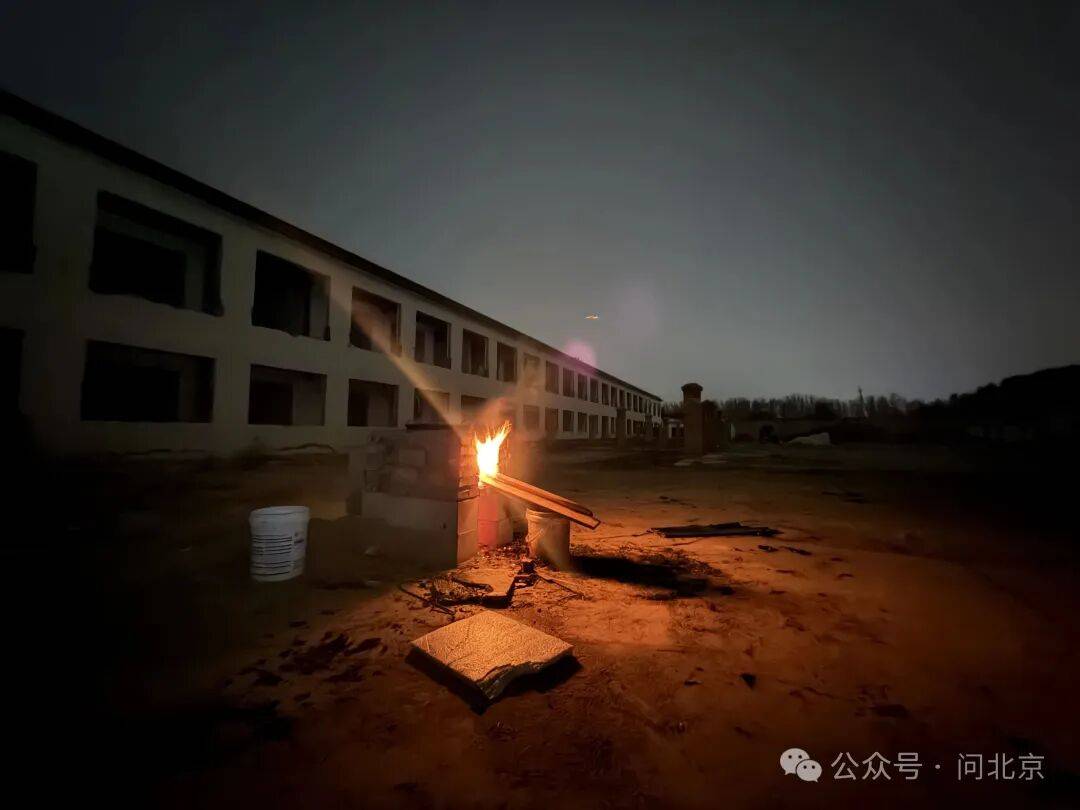 10月22日傍晚6点,气温降到9摄氏度,北京市顺义区赵全营镇北郎中村的演艺小镇内漆黑一片,断电的烂尾楼在细雨笼罩下,显得阴森、寂寥。院内远处隐约的火光是留在这里的施工队,正在烧柴火做饭。