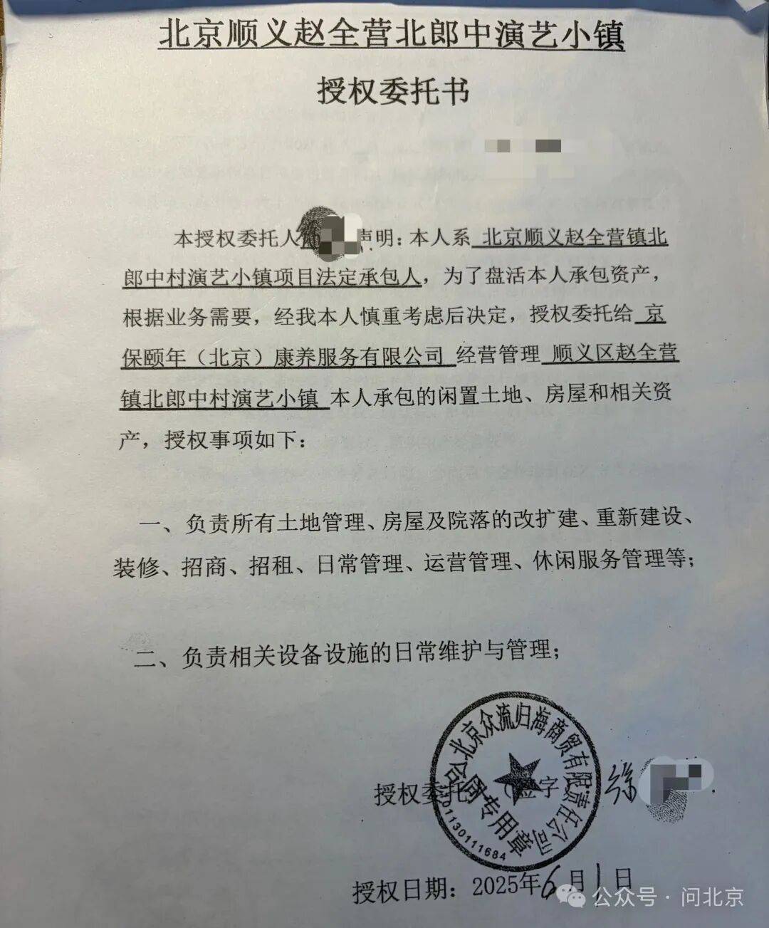 北京顺义赵全营镇北郎中演艺小镇授权委托书/受访者 供图