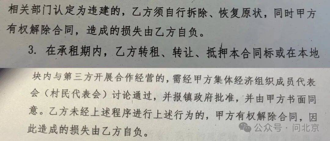 向多方了解后,大家得知,原来京保颐年并不是演艺小镇真正的房东。今年3月,北京市北郎中农工贸集团与北京众流归海商贸有限责任公司(以下简称众流归海)签订了顺义区农村土地租赁合同,其中明确,演艺小镇项目地块面积总计31.28亩,年租赁费用为41.64万元。查看合同后,施工队发现了问题。周先生说:“有一条,在承租期间内,乙方转租、转让、抵押合同,或在本地块内与第三方开展合同经营,需经甲方集体经济组织成员代表会(村民代表会)讨论通过,并报镇政府批准。众流归海没有报,转租给京保颐年,违背了村委会的意愿。”