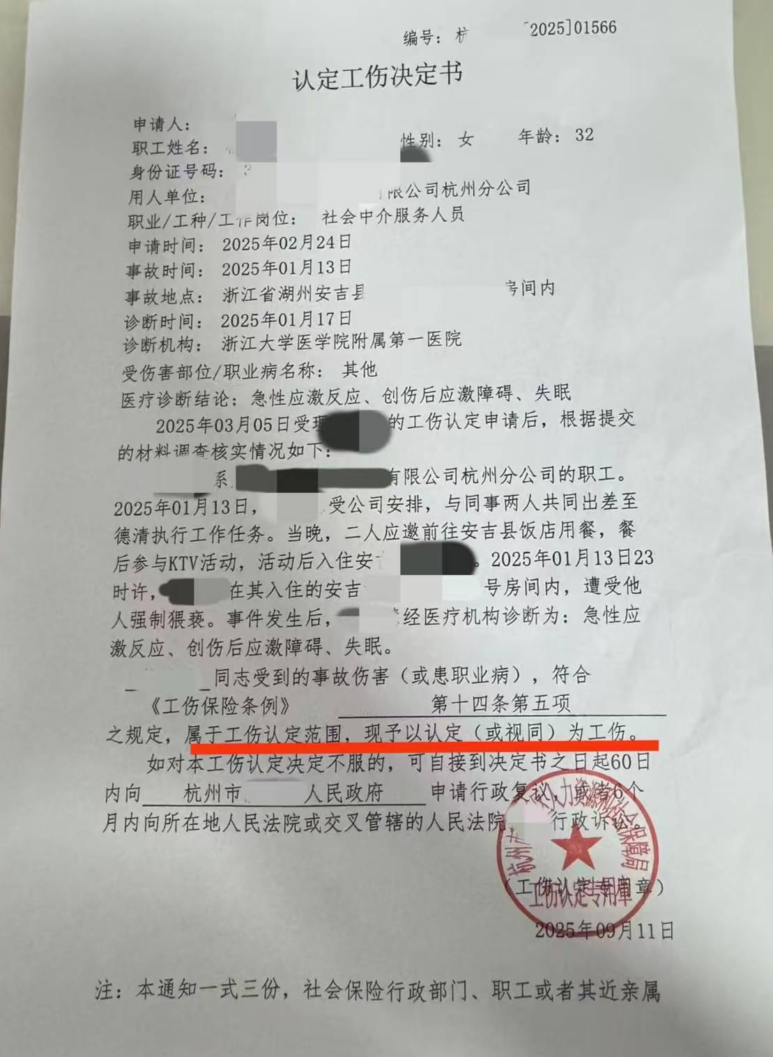 今年9月,浙江杭州某区人社局“参考先例”,为一位出差时遭强制猥亵患上精神类疾病的女职工认定工伤。