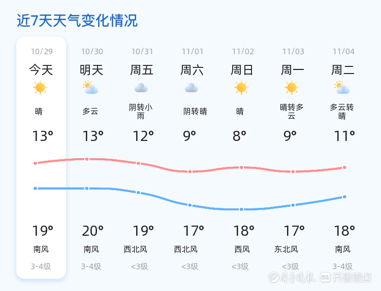 今日(10月29日,农历九月初九,星期三)济南迎来晴转多云的好天气。全市各区气温在13℃至19℃之间,东南风3级,空气湿度53%,PM2.5指数57,空气质量良好。当前时间为6时整,实时气温14.8℃。