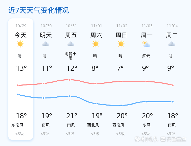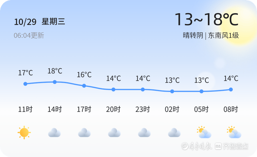 今日是10月29日,星期三,农历九月初九,济宁市天气晴转阴,气温在13℃至18℃之间,东南风1级,空气湿度72%,PM2.5指数77。全市各区天气情况总体平稳,以晴转阴为主,气温适宜,市民出行可选择轻便衣物,注意防晒和保暖。