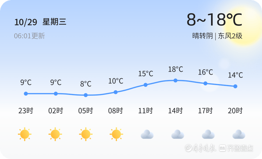 今天是10月29日,星期三,农历九月初九。枣庄市今日天气晴转阴,气温为8℃至18℃,东风2级,空气湿度88%,PM2.5浓度为87,空气质量等级为良好。早晨气温较低,市民出行请注意保暖,随身携带雨具以防天气突变。