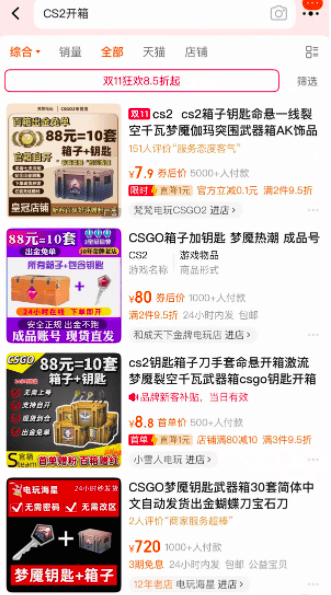 一位CS游戏10年老玩家王星(化名)向红星资本局讲述,上述饰品交易主要通过第三方平台进行。公开信息显示,目前国内玩家常用的平台包括网易BUFF、悠悠有品、c5game、igxe等。此外,CS游戏饰品开箱已经形成了一条成熟的“产业链”,红星资本局注意到,在电商平台上,有不少商家售卖开箱业务。