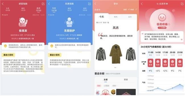 老年人身体机能随年龄增长逐渐变化,对气象环境的敏感度显著高于其他群体:体温调节能力减弱,季节交替时易感冒;关节、心血管等慢性病对气压、湿度、温度变化更为敏感。针对这些健康痛点,墨迹天气的多项指数服务构建起“气象+健康”的防护屏障。