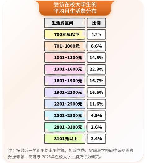 具体来看,受访在校大学生的平均每月生活费在1301~1600元区间的比例最高(22.3%),其后的分别为1601~1900元(16.7%)、1901~2200元(16.5%)与1001~1300元(14.8%)。值得注意的是,若将2501元及以上的各个区间合并计算,累计占比约一成(9.9%),构成了一个拥有较高消费能力的大学生群体。