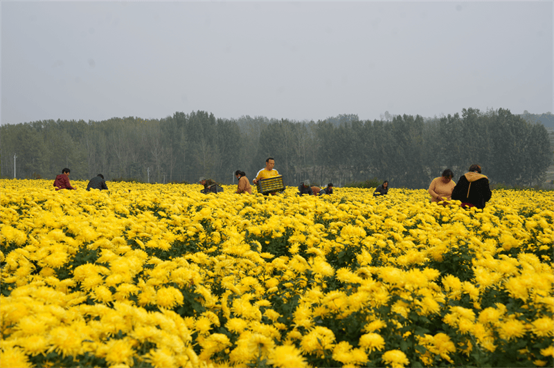 近日,在河南省南阳市镇平县遮山镇陈沟村花之谷花卉种植专业合作社菊花田里,村民们穿梭在一簇簇盛放的菊花间,动作娴熟地采摘着绽放的菊花,忙碌的身影与金色的花海共同勾勒出一幅动人的丰收画卷。