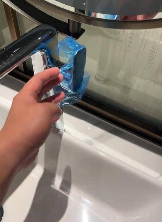 一位博主在视频中表示,他和同事住酒店,同事自带一次性的床单被套等,连盥洗池龙头把手,卫生间门把手,马桶座圈垫,都用蓝色贴膜贴了起来。