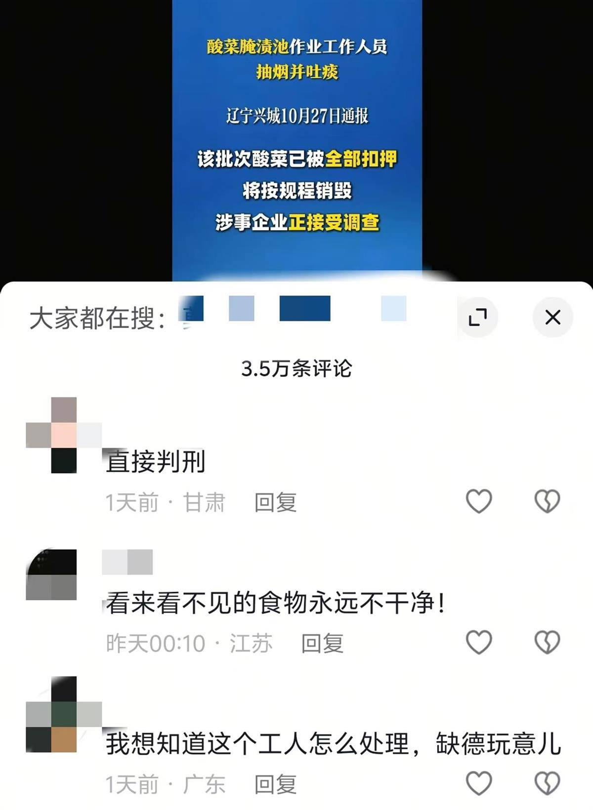 10月27日晚,事发地辽宁省兴城市市场监督管理局发布情况通报称,10月26日当晚,该局连夜开展调查执法,该批次酸菜已被全部扣押,未流入市场,并将按照相关操作规程销毁。相关涉事企业正在接受调查。对于违法企业和相关责任人,将依法严惩、绝不姑息。