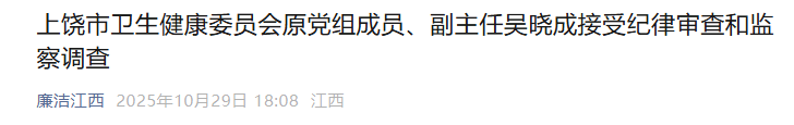 上饶市卫生健康委员会原党组成员、副主任吴晓成涉嫌严重违纪违法,主动向组织交代问题,目前正接受上饶市纪委监委纪律审查和监察调查