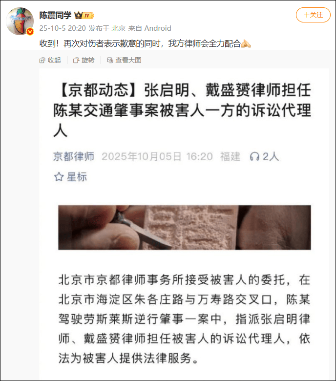 10月5日晚,陈震再次发声。陈震发文称,“再次对伤者表示歉意的同时,我方律师会全力配合。”其配发的照片为“京都律师”微信公众号的一则推文的截图。