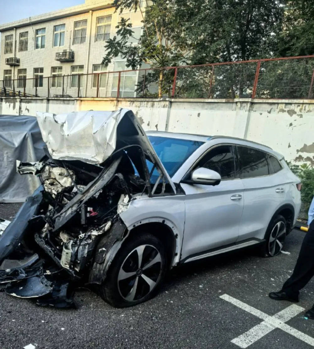 现场照片显示事故车辆车头部分严重凹陷,车内气囊弹出。陈震曾公开表示买车险只买交强险。