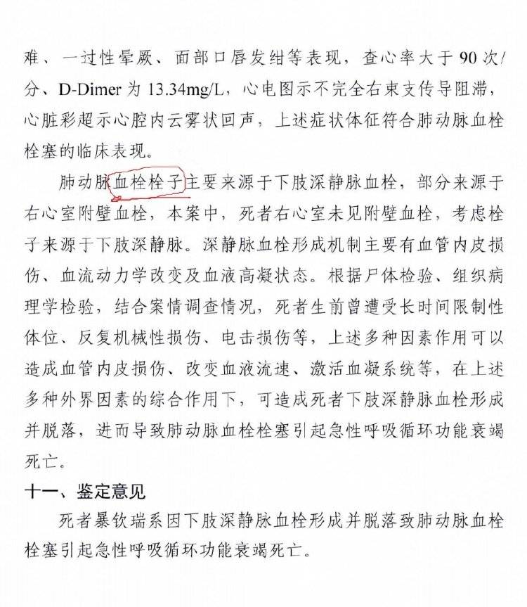 经最高人民检察院司法鉴定中心鉴定,暴钦瑞生前遭受长时间限制性体位、反复机械性损伤、电击损伤等,其下肢深静脉血栓形成并脱落,进而导致肺动脉血栓栓塞,引起急性呼吸循环功能衰竭。