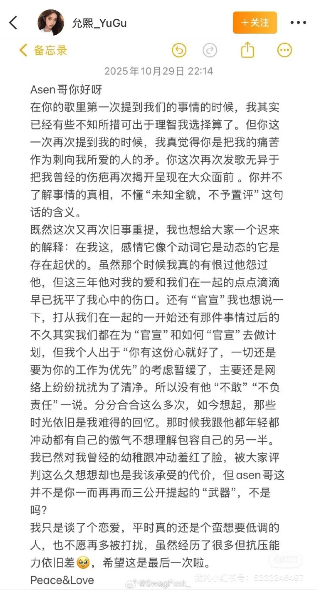 而更狠的是,杨和苏的前女友也发文点名Asen,表示自己的感情不是Asen的武器!