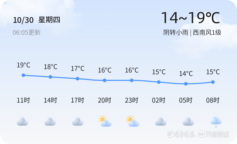 今天是10月30日,星期四,农历九月初十。日照市今日天气阴转小雨,气温在14℃至19℃之间,西南风1级,空气湿度82%。各区天气情况总体平稳,市民出行需注意携带雨具,防范降雨带来的不便。