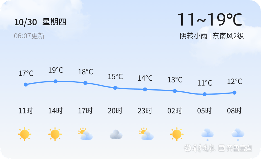 今日(10月30日,星期四,农历九月初十)菏泽市迎来阴雨天气,气温在11℃至19℃之间,东南风2级,空气湿度达88%,PM2.5指数为79。全市各区天气状况基本一致,阴转小雨,提醒市民外出携带雨具并注意保暖。