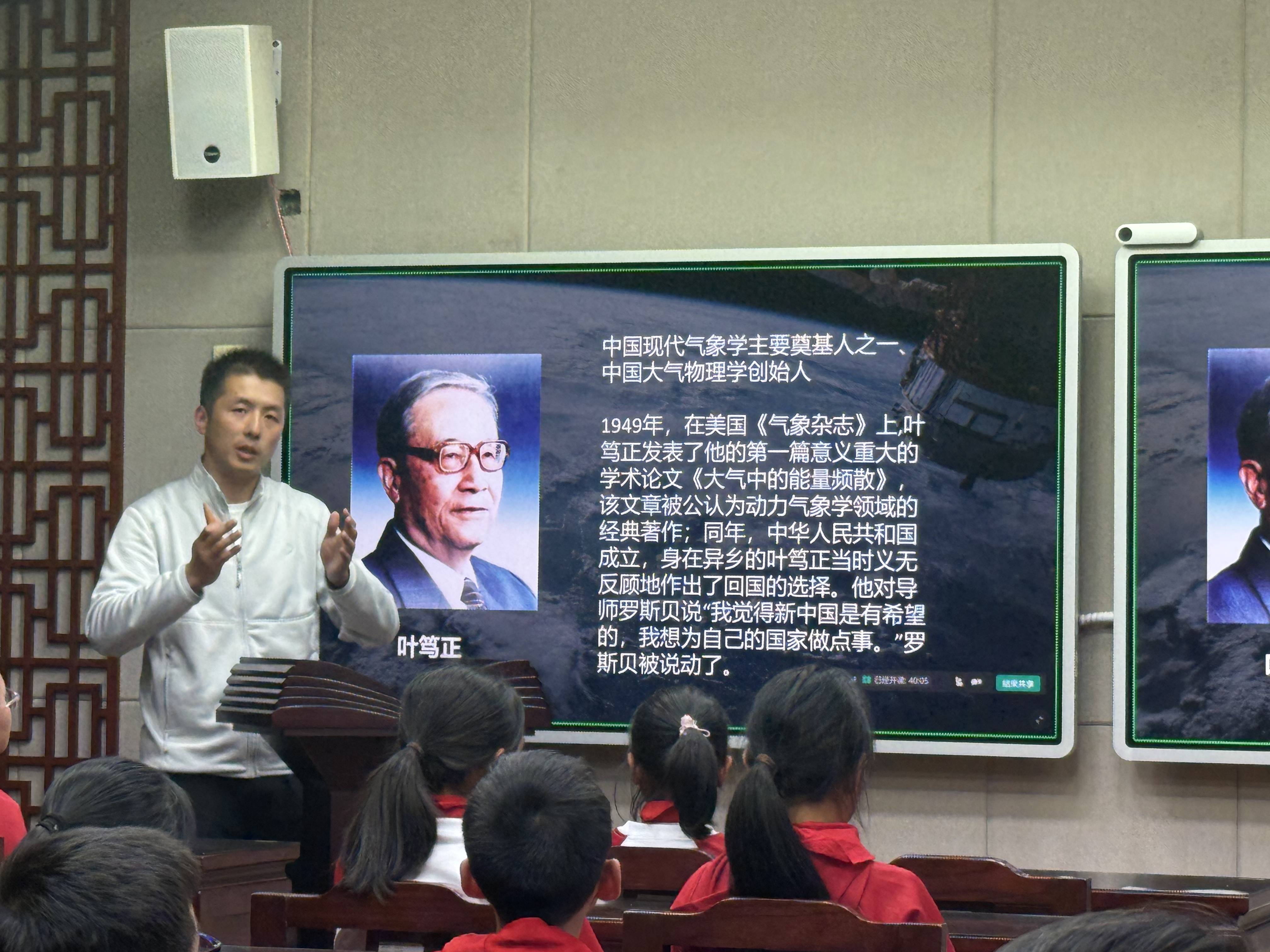 中国科协气象顾问、前中国追风小组核心成员卞赟为学生们讲述著名气象学家的故事。马然 摄