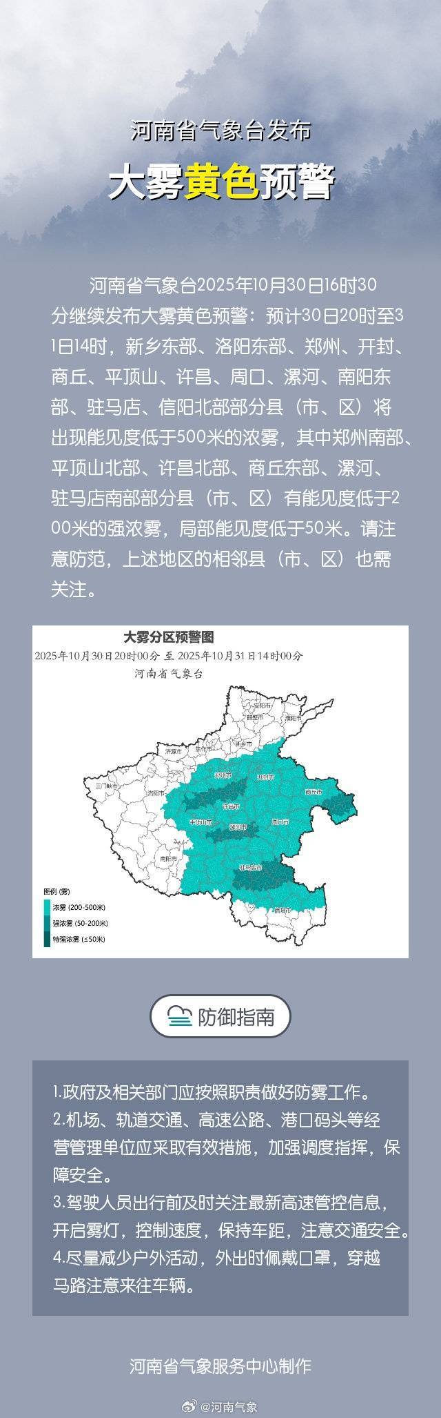 河南省气象台2025年10月30日16时30分继续发布大雾黄色预警:预计30日20时至31日14时,新乡东部、洛阳东部、郑州、开封、商丘、平顶山、许昌、周口、漯河、南阳东部、驻马店、信阳北部部分县(市、区)将出现能见度低于500米的浓雾,其中郑州南部、平顶山北部、许昌北部、商丘东部、漯河、驻马店南部部分县(市、区)有能见度低于200米的强浓雾,局部能见度低于50米。请注意防范,上述地区的相邻县(市、区)也需关注。
