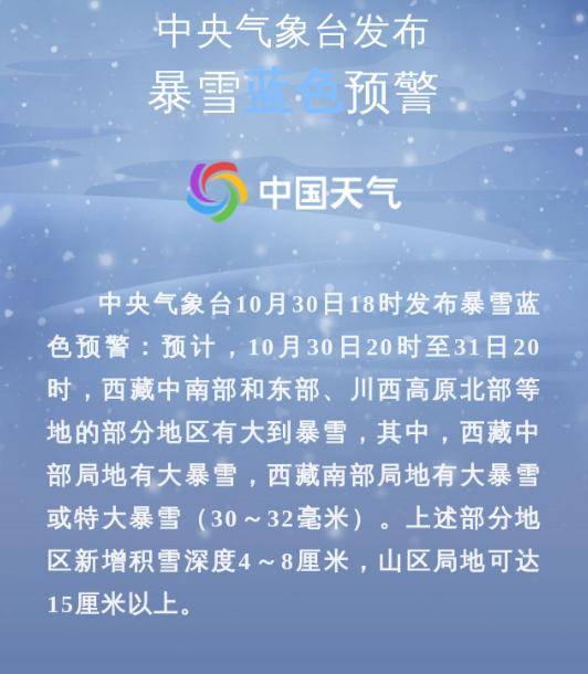 中央气象台昨日发布消息,受印度附近双气旋及高原槽过境的共同影响,一场强降雪正在青藏高原展开。预警指出,从昨晚(30日)8时至今晚8时,西藏中南部和东部、川西高原北部等地有大到暴雪。其中,西藏南部局地甚至可能出现30至32毫米的特大暴雪,新增积雪深度在山区局地可达15厘米以上。