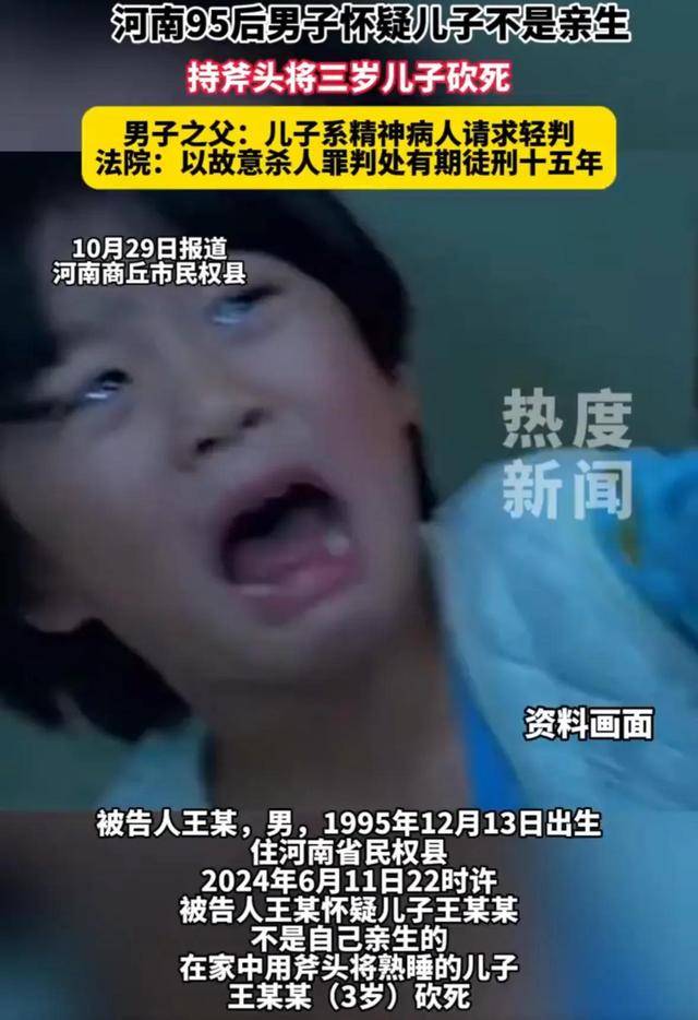 被告人王某,男,1995年12月13日出生住河南省民权县,2024年6月11日22时许被告人王某怀疑儿子王某某不是自己亲生的,在家中用斧头将熟睡的儿子王某某(3岁)砍死。(热度新闻)