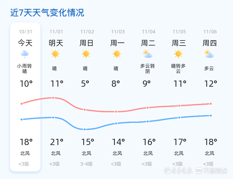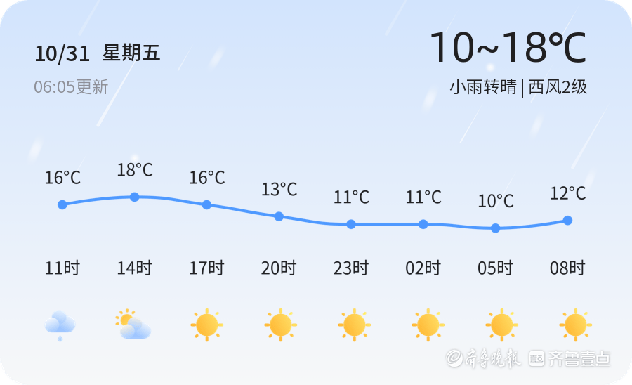 今天是10月31日,星期五,农历九月十一。日照市今日天气由小雨转晴,气温在10℃至18℃之间,湿度较高,风力较小。各区天气情况总体平稳,市民出行需注意携带雨具,防范短时降雨带来的不便。明日将迎来更晴朗的天气,气温将有所回升,预计最高气温可达21℃,最低气温11℃。与今日相比,明日天气晴朗,阳光充足,市民可抓住有利时机进行户外活动。未来三天,日照市天气将以晴为主,气温呈现先升后降趋势,其中周日最低气温将降至5℃,风力有所增强。市民需及时关注天气变化,适时增减衣物,防范低温带来的不适。温馨提示