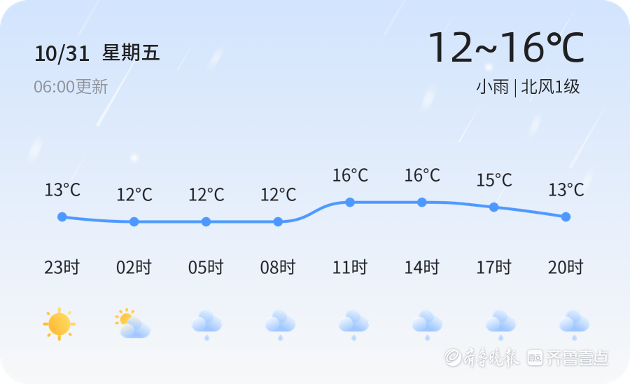 今天是10月31日,星期五,农历九月十一。济南全市范围内普降小雨,气温在12℃至16℃之间,北风1级,空气湿度达到96%。各区的天气情况基本一致,均为小雨天气,温度变化不大。PM2.5指数为95,空气质量良好。