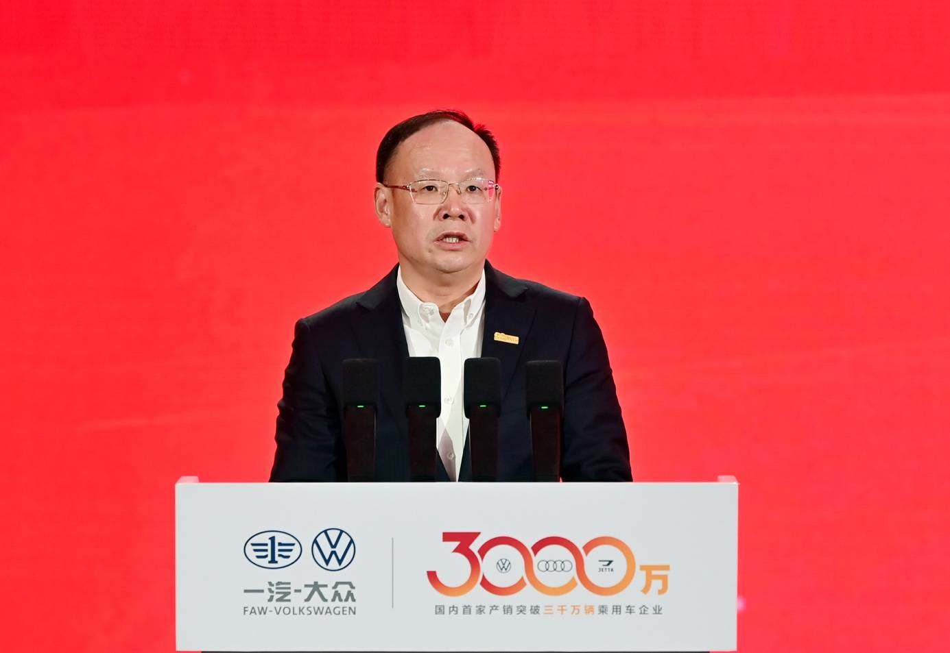 中国一汽董事长、党委书记邱现东在致辞中表示,今年恰逢中欧建交50周年,一汽-大众第3000万辆整车下线,更具有重大的时代意义。这一历史性成就和标志性事件,充分彰显了中国对外开放的强大活力,有力诠释了我国超大规模市场的独特优势,生动反映了中德汽车产业合作的深厚潜力,鲜明体现了我国市场化、法治化、国际化的一流营商环境。一汽-大众产销突破3000万辆,必将为深化中欧经贸合作、推动全球特别是中国汽车产业高质量发展注入新动能。一汽-大众成为国内首家跨越3000万辆的乘用车企业,这份成就根本在于坚持和加强党的全面领导,归功于中德双方始终如一的并肩共进,归功于广大用户一路相伴的深情厚爱,归功于全体伙伴风雨同舟的鼎力支持,归功于全体员工勠力同心的艰苦付出。中国一汽将全面贯彻党中央“扩大高水平对外开放,开创合作共赢新局面”战略部署,深入落实习近平总书记视察一汽重要讲话精神,持续深化与大众汽车集团的合作共赢、双向赋能,发挥各自优势,大力推进自主、合资一体化研发,整车、总成、生态一体化布局,努力将一汽-大众建设成为新时代汽车产业高质量发展和高水平对外开放新标杆,为建设汽车强国、促进经济社会发展、服务构建新发展格局作出新的更大贡献。