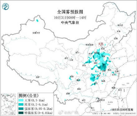 中央气象台10月31日06时继续发布大雾黄色预警:10月31日早晨至上午,河北中南部、河南北部和东部、山东中西部、山西中南部、陕西关中、安徽中北部、江苏北部、湖北中部、湖南北部、四川盆地西部等地有大雾,其中,河北南部、河南东部、山东西北部、安徽中北部、山西中南部、陕西关中东部、湖南北部等地的部分地区有能见度不足500米的浓雾,局地有能见度不足200米的强浓雾。(中国天气网)