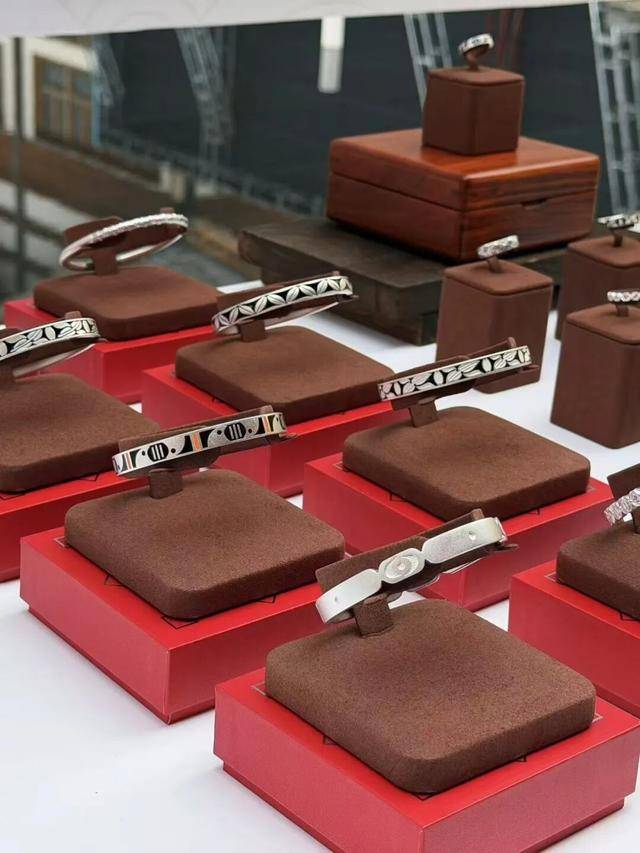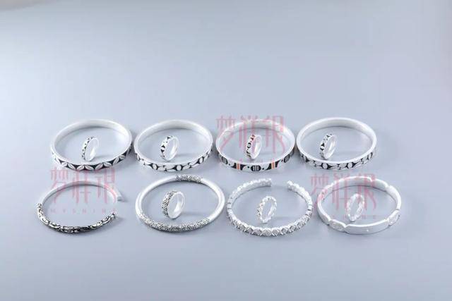 李梦荷在颁奖现场谈及设计灵感来源时说,她借鉴了仰韶陶器的实用性与艺术性,提取了花瓣纹、鸟纹、几何纹等,在作品中实现了传统符号现代化转译,制作为手镯、戒指形态,开口设计是为了方便佩戴,珐琅彩点缀呼应仰韶彩陶色调,局部采用古法银工艺,还可做镀金处理,主打中性风格扩大受众。产品可自由组合,客单价灵活,适配节日营销,银材质兼具亲民、安全、金融属性,手工錾刻与珐琅上色彰显非遗传承。