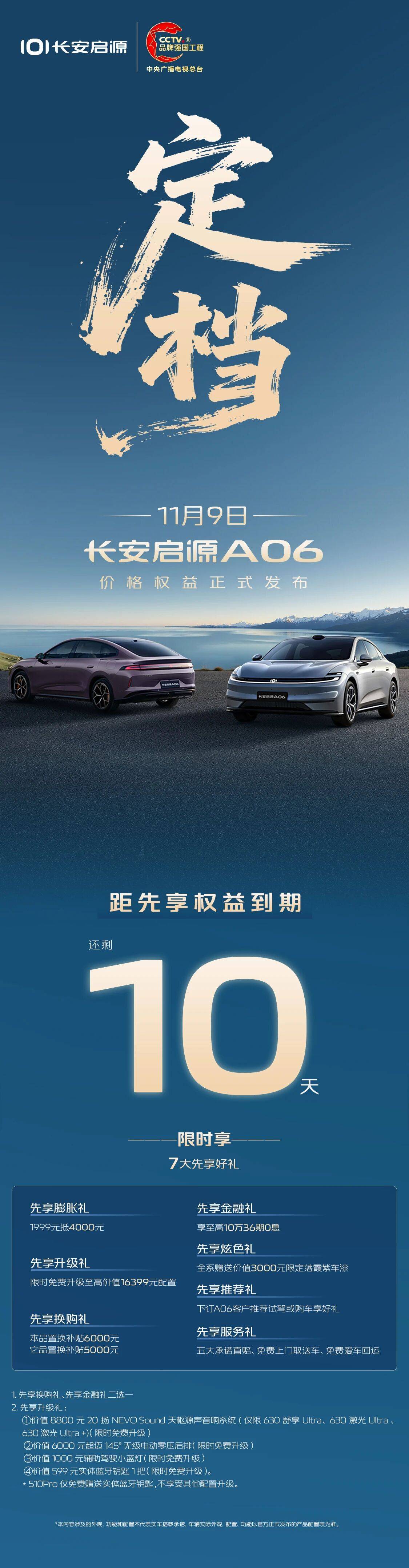 网通社资讯日前,长安启源公布,长安启源A06将于11月9日正式上市,新车此前已经开启了预售,共推出6款车型,提供了纯电、增程动力,预售价区间为11.99-15.99万元。新车基于SDA平台打造,定位“大美舒享新家轿”,配备800V平台+6C闪充,续航达630km。