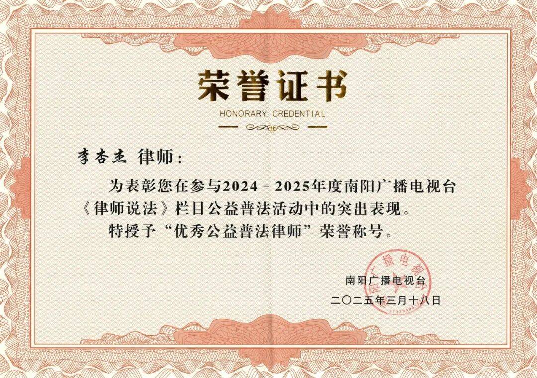 近日,南阳广播电视台颁发2024-2025年度“优秀公益普法律师”,北京盈科(南阳)律师事务所民事争议解决法律事务部主任、知识产权法律事务部主任李杏杰律师凭借其在《律师说法》栏目中的专业贡献与公益热忱,获此殊荣。