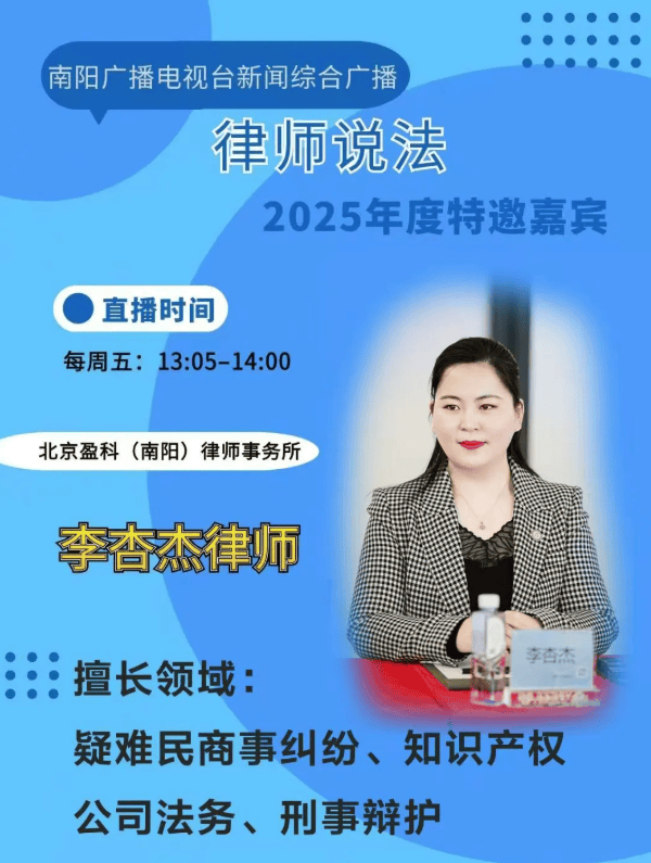 李杏杰律师多次受邀走进直播间,将专业的法律条文转化为群众听得懂、用得上的 “维权指南”“风险提示”。 从婚姻家庭纠纷到知识产权保护,从合同风险防范到消费者权益维护,她的普法内容覆盖民生热点,借助广播的声频传播优势,触达南阳城乡各个角落,让法治声音传得更远、扎根更深,进而有效提升公民的法律意识和法治素养,对推动全社会形成办事依法、遇事找法、解决问题用法、化解矛盾靠法的良好氛围具有积极意义。