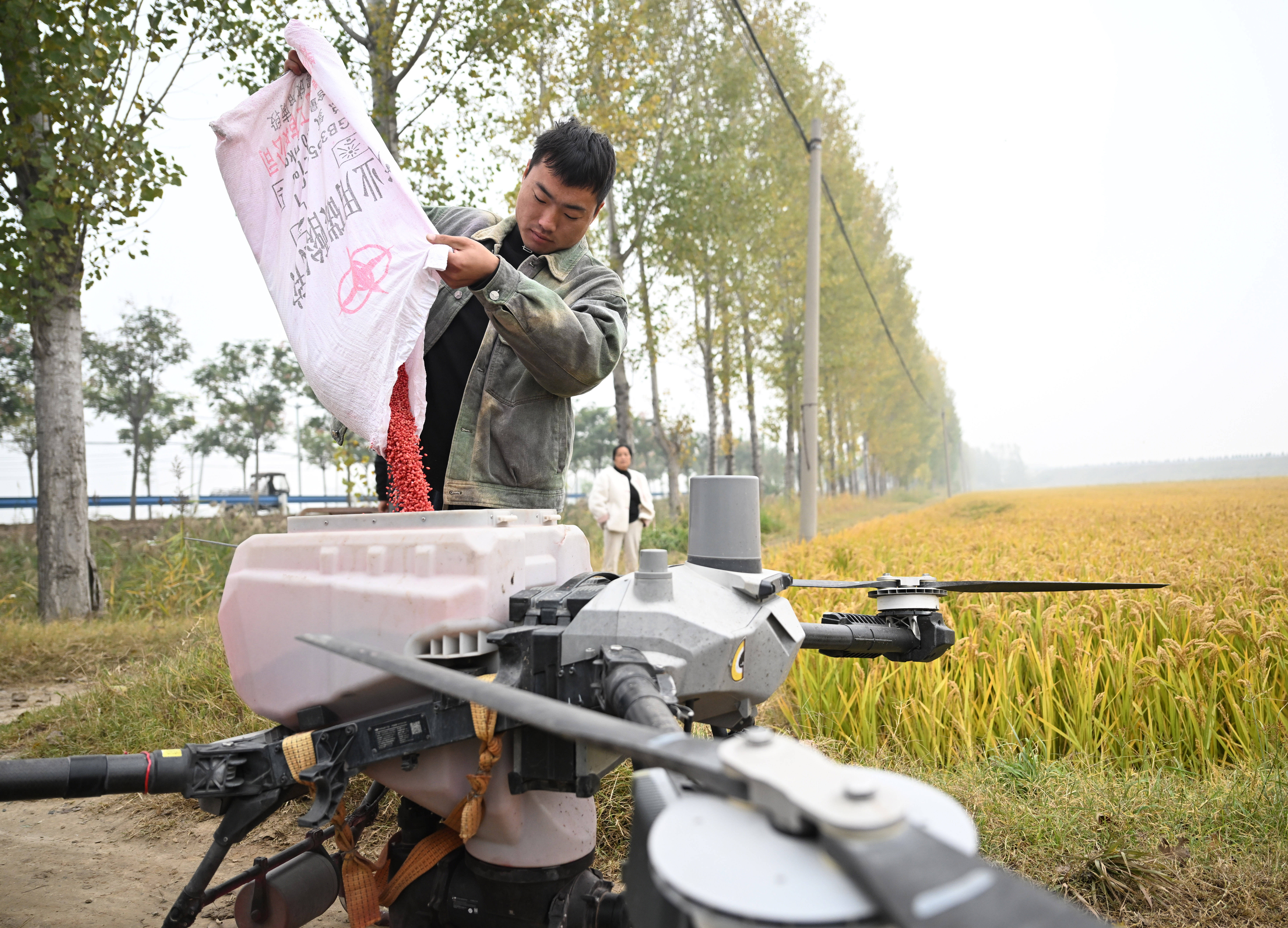 10月30日,在河南省原阳县太平镇太南村,农机手向无人机加载小麦种子。 新华社记者 李嘉南 摄