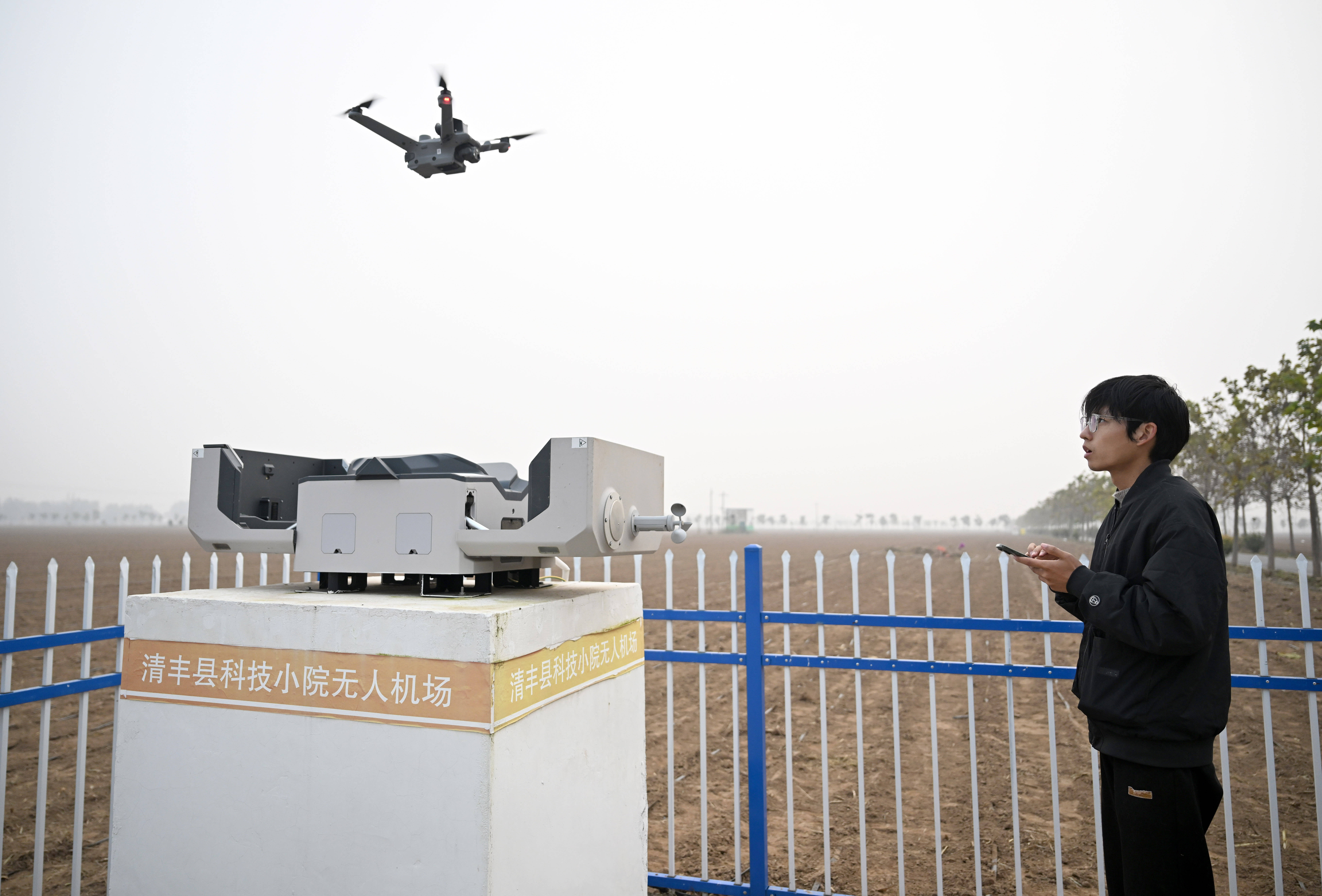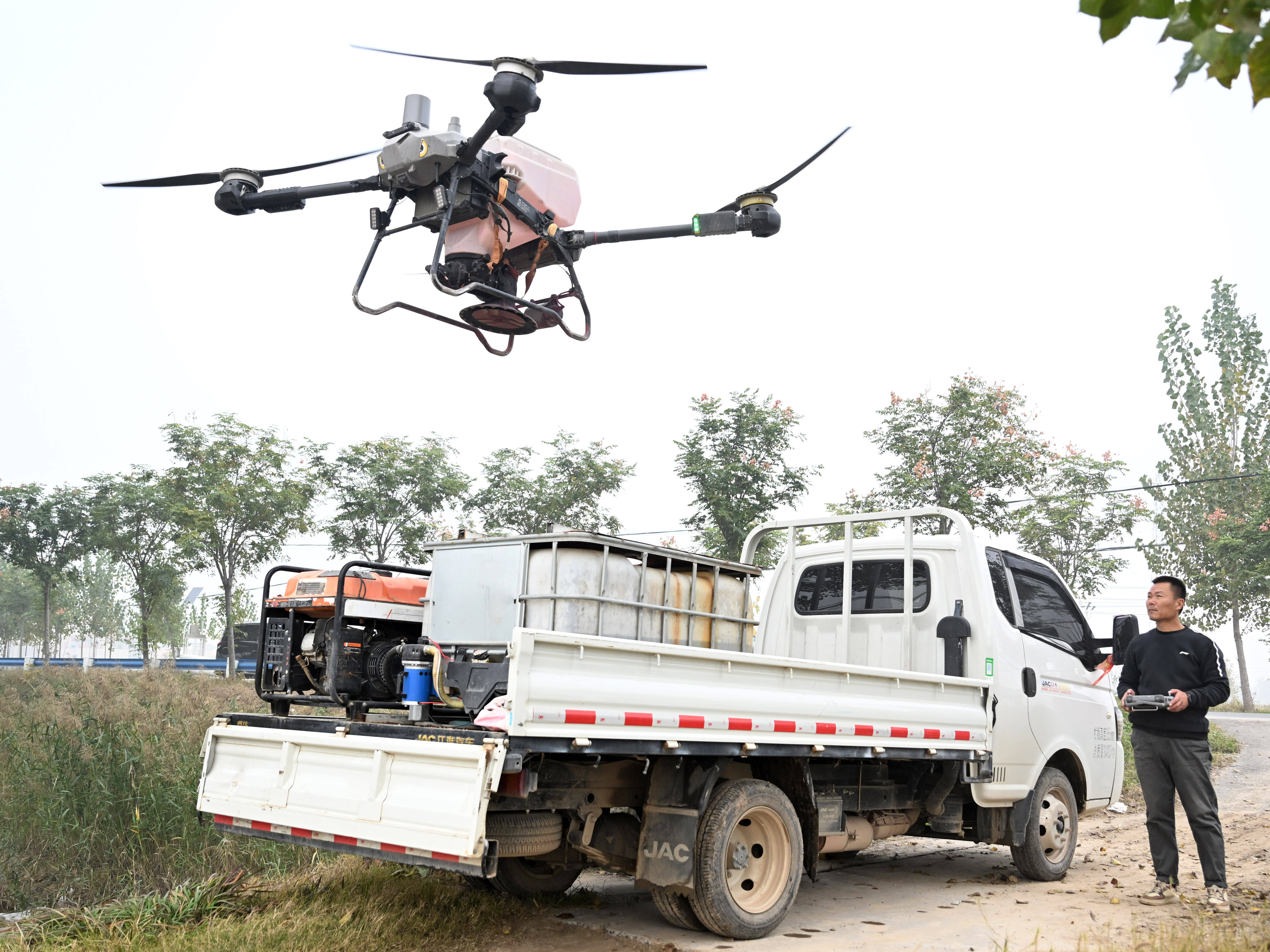 10月30日,在河南省清丰县固城镇张庄里村,农户在操作无人巡田机起飞。 新华社记者 李嘉南 摄