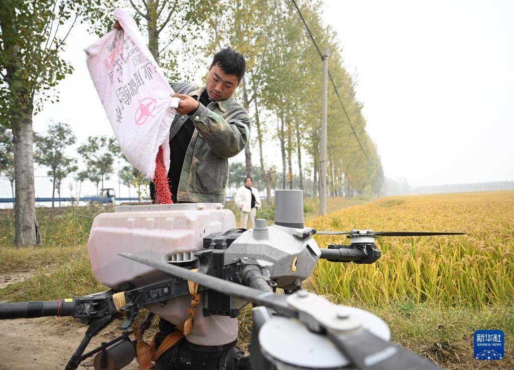 10月30日,在河南省清丰县固城镇张庄里村,农户在操作无人巡田机起飞。