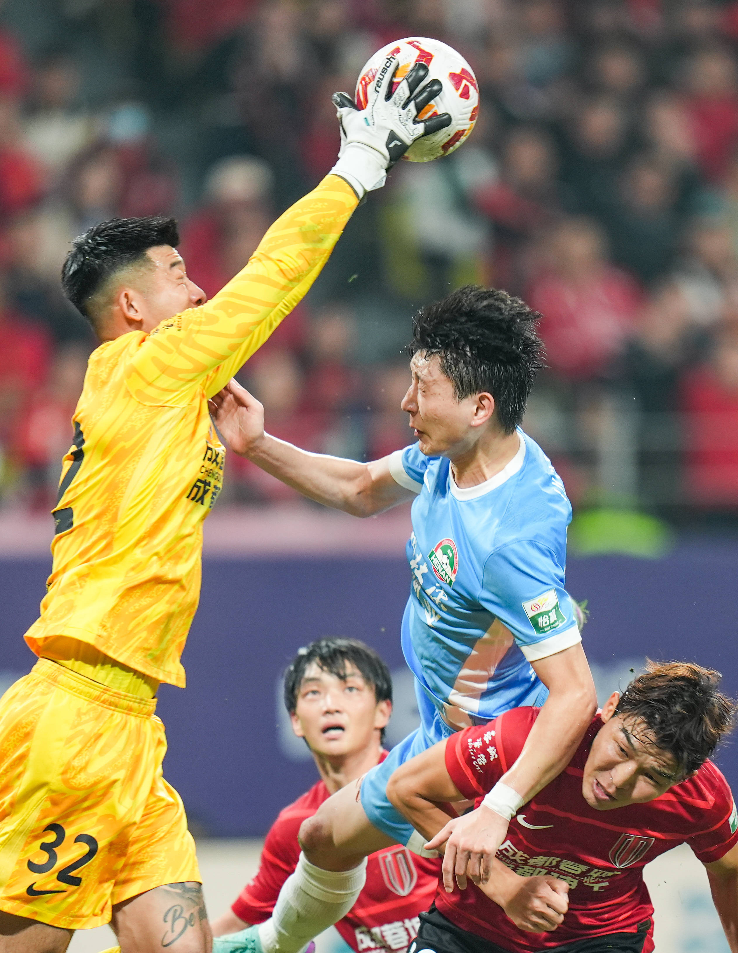 10月31日,成都蓉城队守门员刘殿座(左一)比赛中扑救。 新华社记者 王曦 摄