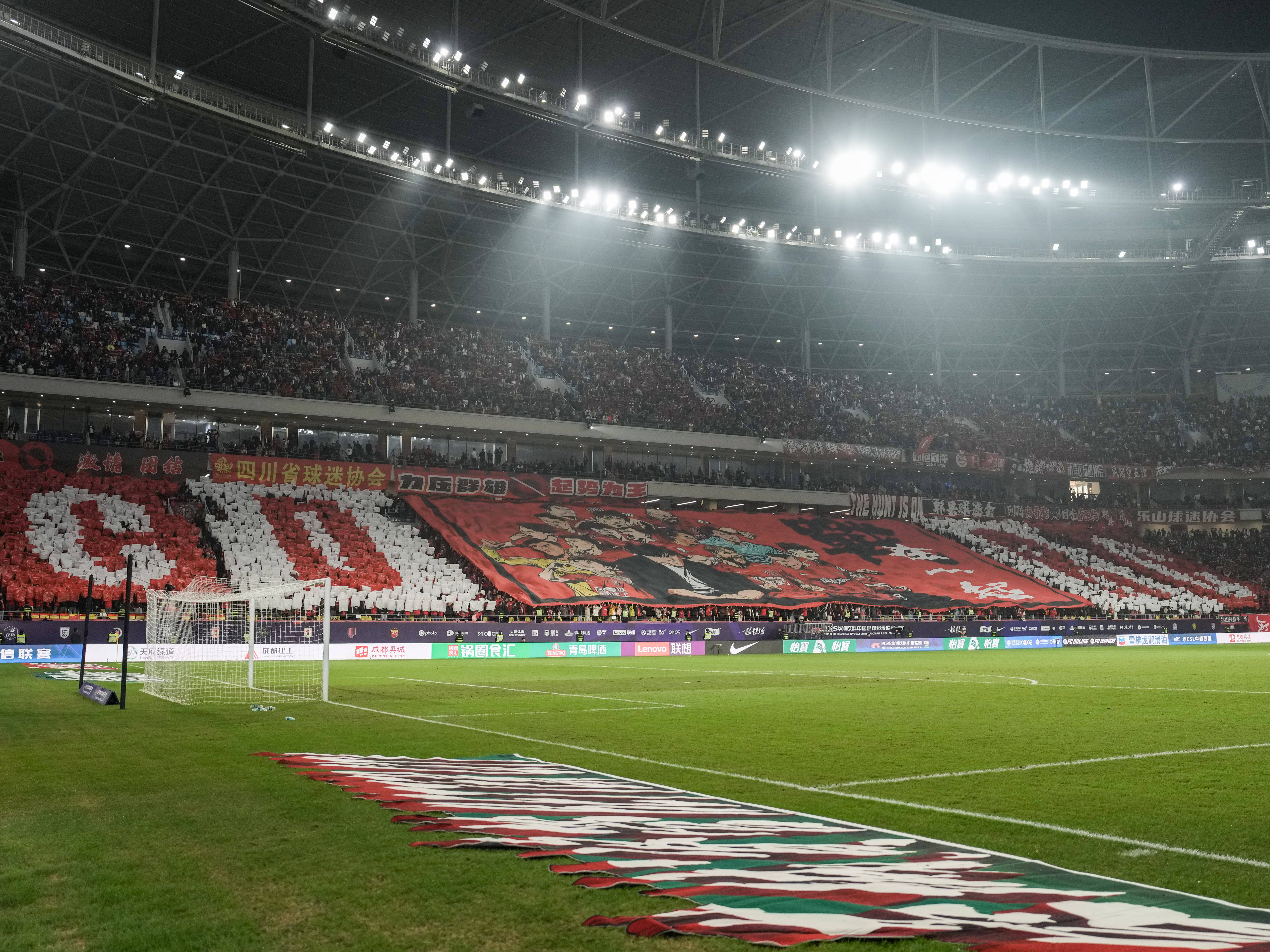 10月31日,成都蓉城队球迷在赛前观众席上打出巨幅TIFO(可覆盖看台的大型横幅或拼图)。 新华社记者 王曦 摄