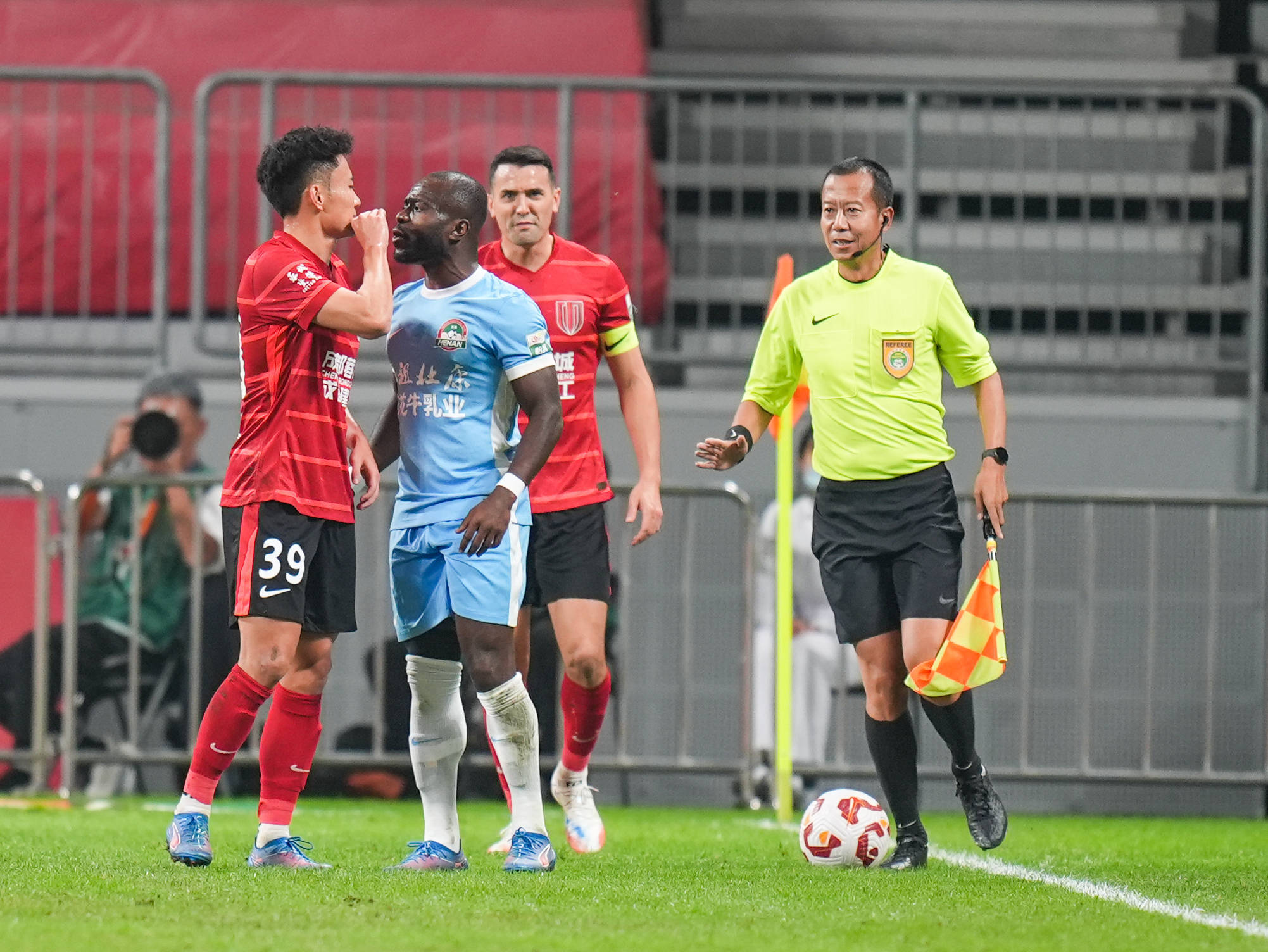 10月31日,成都蓉城队球员甘超(左一)与河南俱乐部酒祖杜康队球员阿奇姆彭(左二)在比赛中发生争执。 新华社记者 王曦 摄