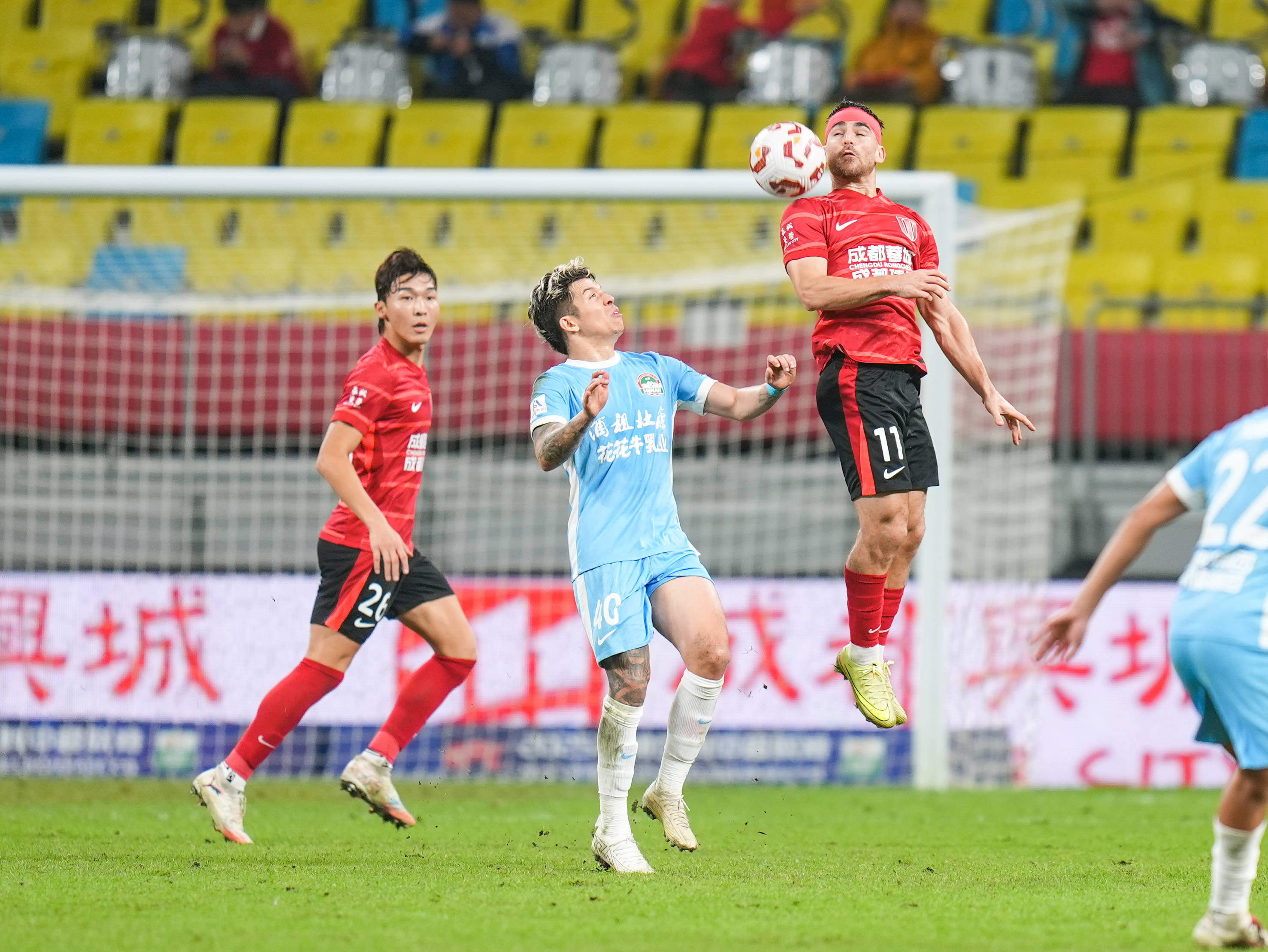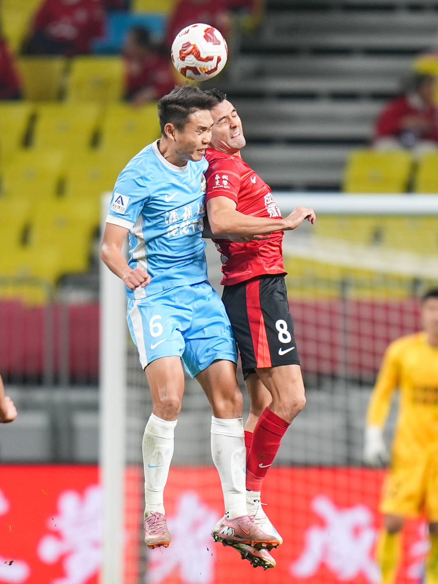 10月31日,成都蓉城队球员周定洋(右)与河南俱乐部酒祖杜康队球员王上源在比赛中争顶。 新华社记者 王曦 摄