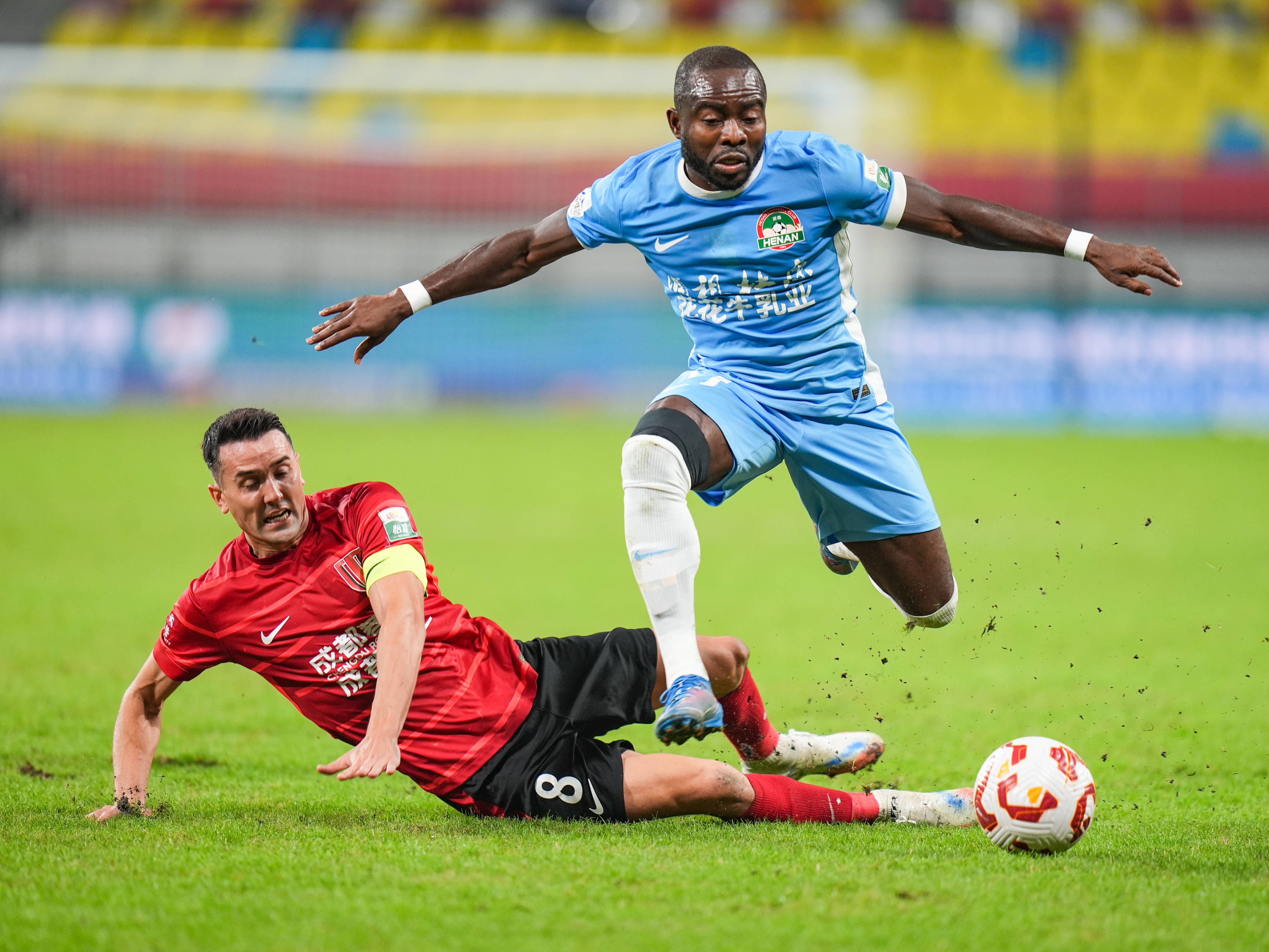 10月31日,河南俱乐部酒祖杜康队球员纳萨里奥(右一)在比赛中射门。 新华社记者 王曦 摄